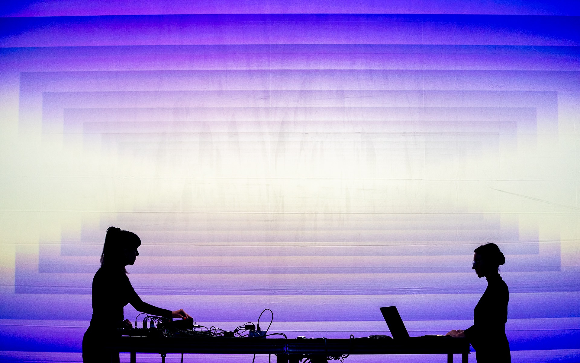 Formant le duo Le désert mauve, Charline Dally et Gabrielle HB explorent les relations sensibles entre les vibrations visuelles et sonores. Les tableaux vidéo abstraits que Dally crée par l’entre- mise de la synthèse modulaire et de boucles de rétroaction se caractérisent par des nuances saturées et des lignes ondoyantes. Ils s’inspirent librement des pratiques pionnières de Lillian Schwartz et des Vasulkas. Au plan sonore, HB conçoit un espace minimal, misant sur la délicatesse du geste et une économie de moyens matériels. À l’aide de deux oscillateurs et d’un synthéti- seur polyphonique, elle s’inspire du travail de Radigue, Ciani et Oliveros, composant des plages souples et lumineuses. Ensemble, les oscillations auditives et visuelles s’hybrident et se transfor- ment à travers des progressions délibérément lentes qui produisent un effet quasi hypnotique.